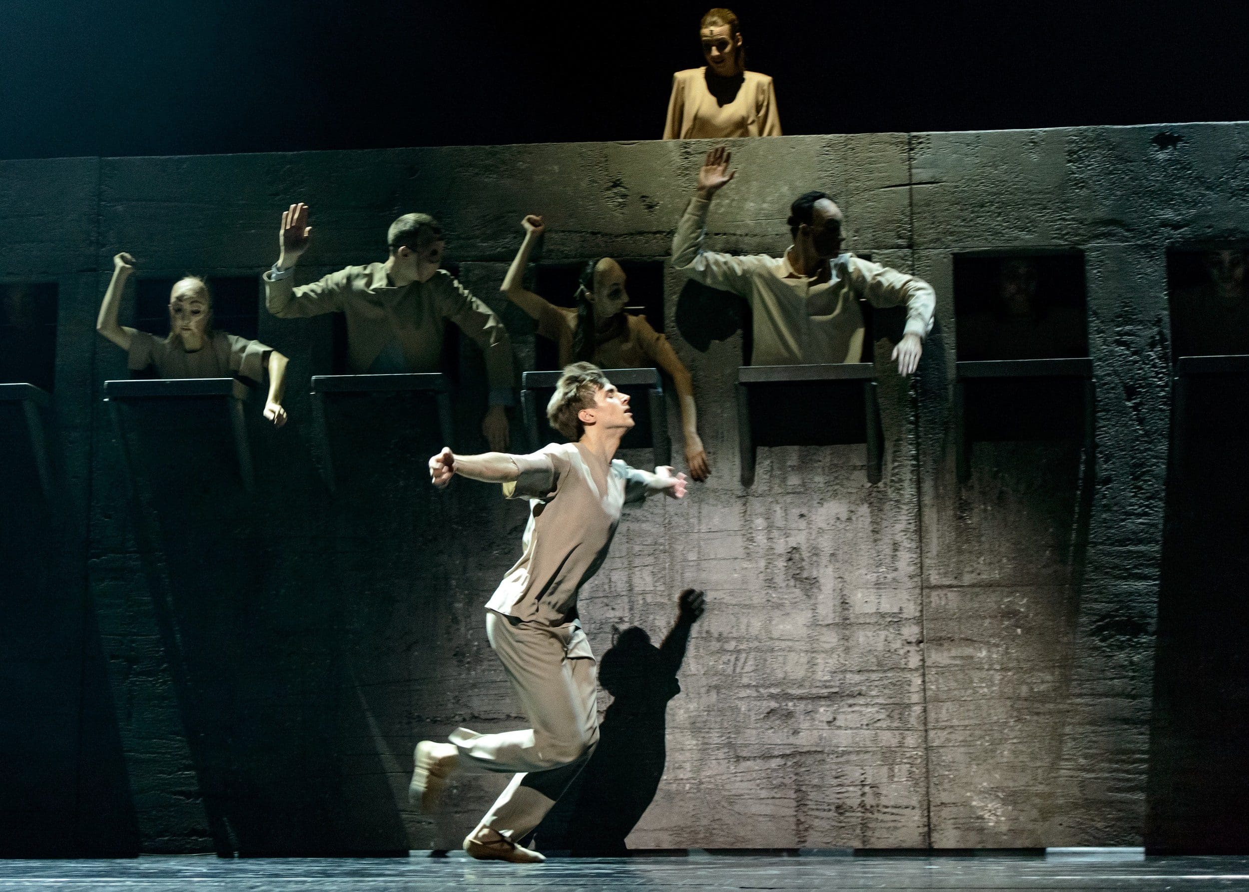 האמצעים הבימתיים מתחזקים חלל אפרורי, קודר ומעורפל שמהדהד את עיצוב וגווני התלבושות, סט ואור. הם מקלים על החומרה של סצנות אניגמאטיות במיוחד כמו זו שבה הרקדנים יוצרים טוטם של ראש מעל ראש כאשר גופם בחשיכה ופניהם מוארות-זורחות , כמצבור אנכי של גולגלות, באמירה ויזואלית מרשימה שמרפררת לעבודת עבר. במובן דומה היא מאפשרת מעבר זורם מתמונה סוריאליסטית אחרת שבה שורת אנשים עטוי מסכות דמויות פנים חסרי פרטים פורצות ממפתחים צרים בחומת כלא אפורה ומאיימת, אל תמונת במה היפר-ריאליסטית כאשר המון זועם עצום שוטף את הבמה הלוך ושוב –בכמה הזדמנויות- כשהוא מוחה באלימות מול עמדה פוליטית עמומה.